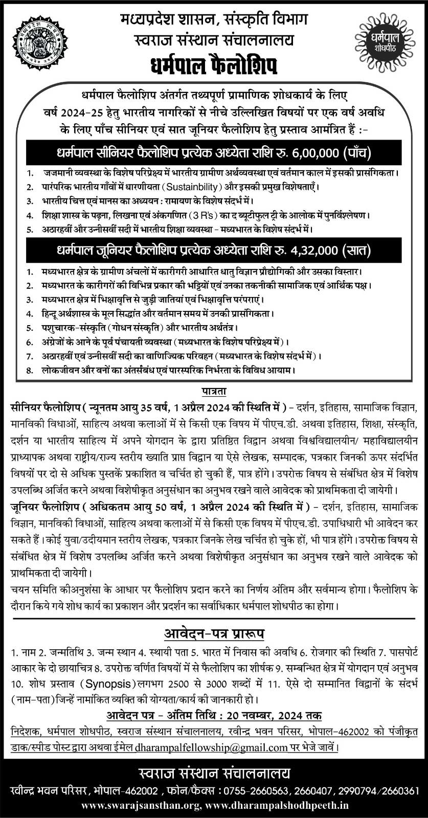 निर्धारित अवधि में प्राप्त आवेदन एक उच्च स्तरीय निर्णायक मंडल के समक्ष प्रस्तुत किये जाते हैं। निर्णायक मंडल की अनुशंसा के पश्चात एक वर्ष के लिए सीनियर एवं जूनियर फेलोशिप प्रदान की जाती है।